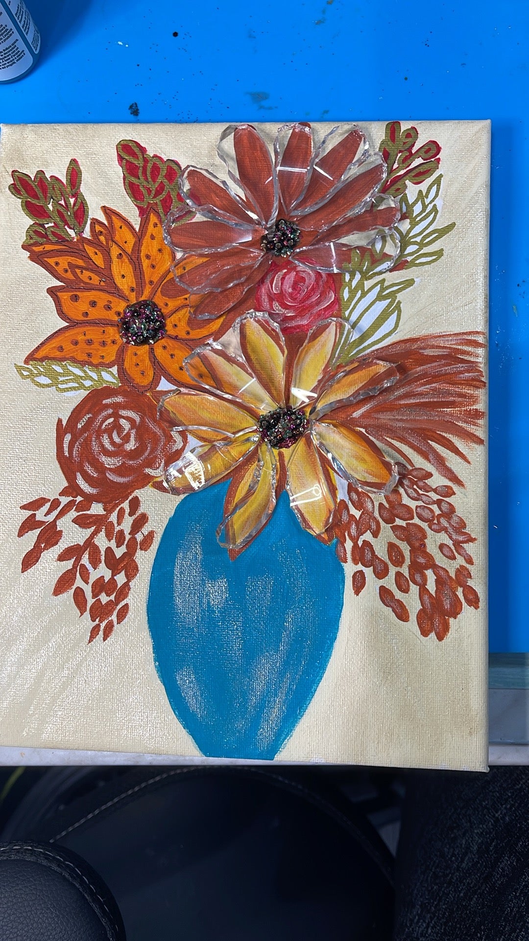 9x10 acrylic painted Fall Floral colors, with cut glass for petals, and Beads, with Resin.